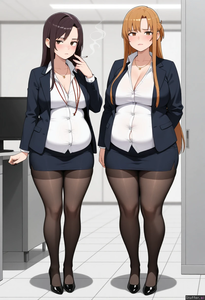 kipteitei, ohasi_art, spellsx, betterwithsalt, ((very detailed)) 1girl, businesswoman, asuna_(sao), long hair, brown hair, brown eyes, mature_female, evil. She is wearing black mini pencil skirt, black stockings, black suit jacket, white buttoned shirt, black heels, long black fingernails, black lips, dark eyeshadow, necklace. she is curvy, voluptuous, overweight, obese, with thick thighs, chubby fingers, fat_arms, fat waist, muffin_top, medium breasts, round face, fat face, double chin and a big round fat belly. She is bored, arrogant, vain, mean, annoyed, pissed off. At the office, girl is smoking a cigarette