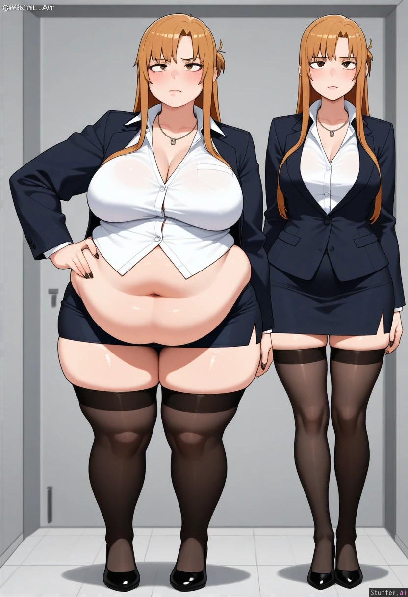 kipteitei, ohasi_art, spellsx, betterwithsalt, ((very detailed)) 1girl, businesswoman, asuna_(sao), long hair, brown hair, brown eyes, mature_female, evil. She is wearing black mini pencil skirt, black stockings, black suit jacket, white buttoned shirt, black heels, long black fingernails, black lips, dark eyeshadow, necklace. she is curvy, voluptuous, overweight, obese, with thick thighs, chubby fingers, fat_arms, fat waist, muffin_top, medium breasts, round face, fat face, double chin and a big round fat belly. She is bored, arrogant, vain, mean, annoyed, pissed off. At the office, girl is smoking a cigarette, doggy_style