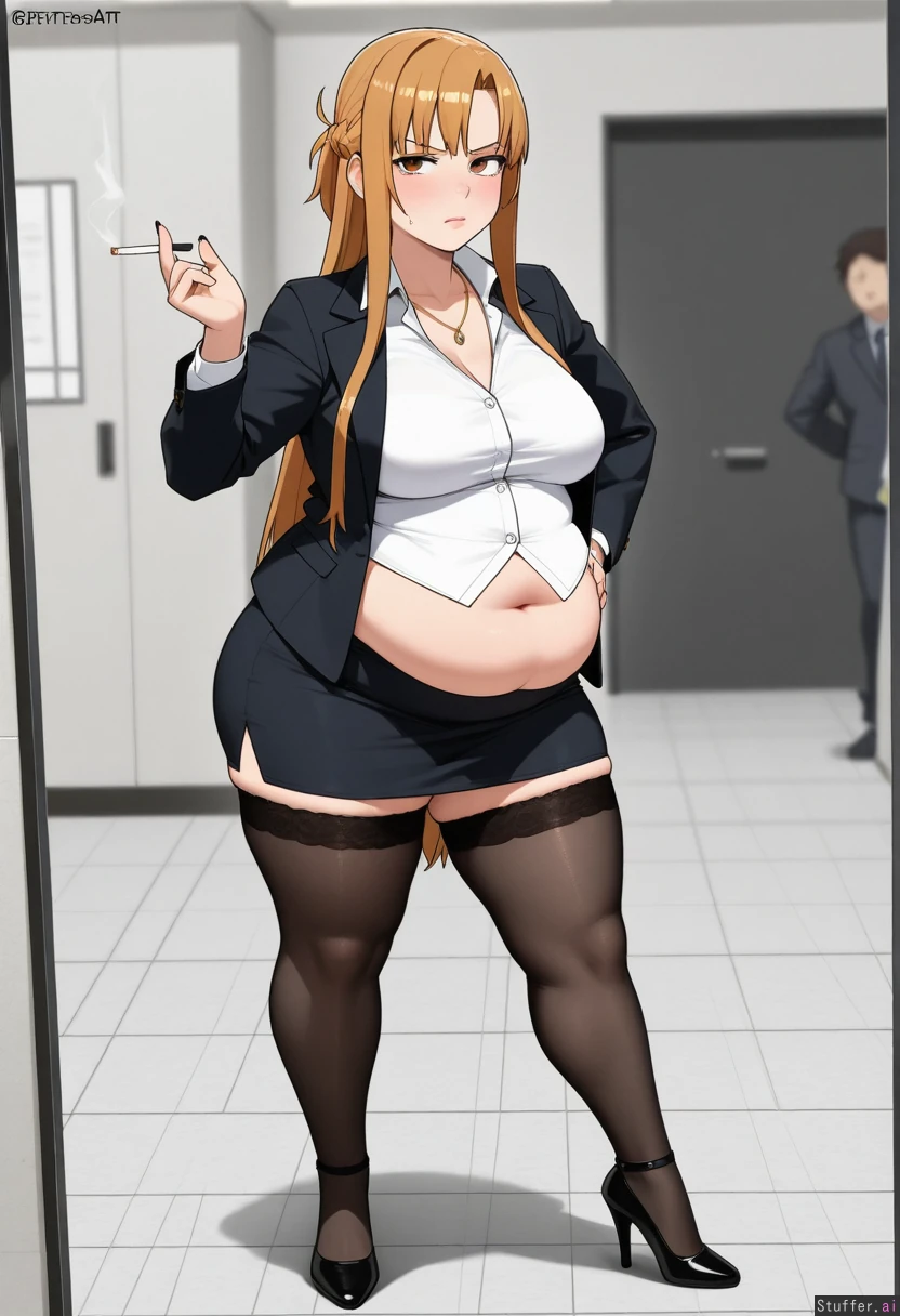 kipteitei, ohasi_art, spellsx, betterwithsalt, ((very detailed)) 1girl, businesswoman, asuna_(sao), long hair, brown hair, brown eyes, mature_female, evil. She is wearing black mini pencil skirt, black stockings, black suit jacket, white buttoned shirt, black heels, long black fingernails, black lips, dark eyeshadow, necklace. she is curvy, voluptuous, overweight, obese, with thick thighs, chubby fingers, fat_arms, fat waist, muffin_top, medium breasts, round face, fat face, double chin and a big round fat belly. She is bored, arrogant, vain, mean, annoyed, pissed off. At the office, girl is smoking a cigarette, doggy_style