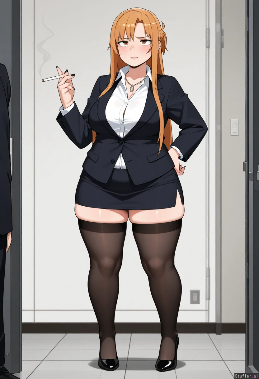 kipteitei, ohasi_art, spellsx, betterwithsalt, ((very detailed)) 1girl, businesswoman, asuna_(sao), long hair, brown hair, brown eyes, mature_female, evil. She is wearing black mini pencil skirt, black stockings, black suit jacket, white buttoned shirt, black heels, long black fingernails, black lips, dark eyeshadow, necklace. she is curvy, voluptuous, overweight, obese, with thick thighs, chubby fingers, fat_arms, fat waist, muffin_top, medium breasts, round face, fat face, double chin and a big round fat belly. She is bored, arrogant, vain, mean, annoyed, pissed off. At the office, girl is smoking a cigarette, doggy_style