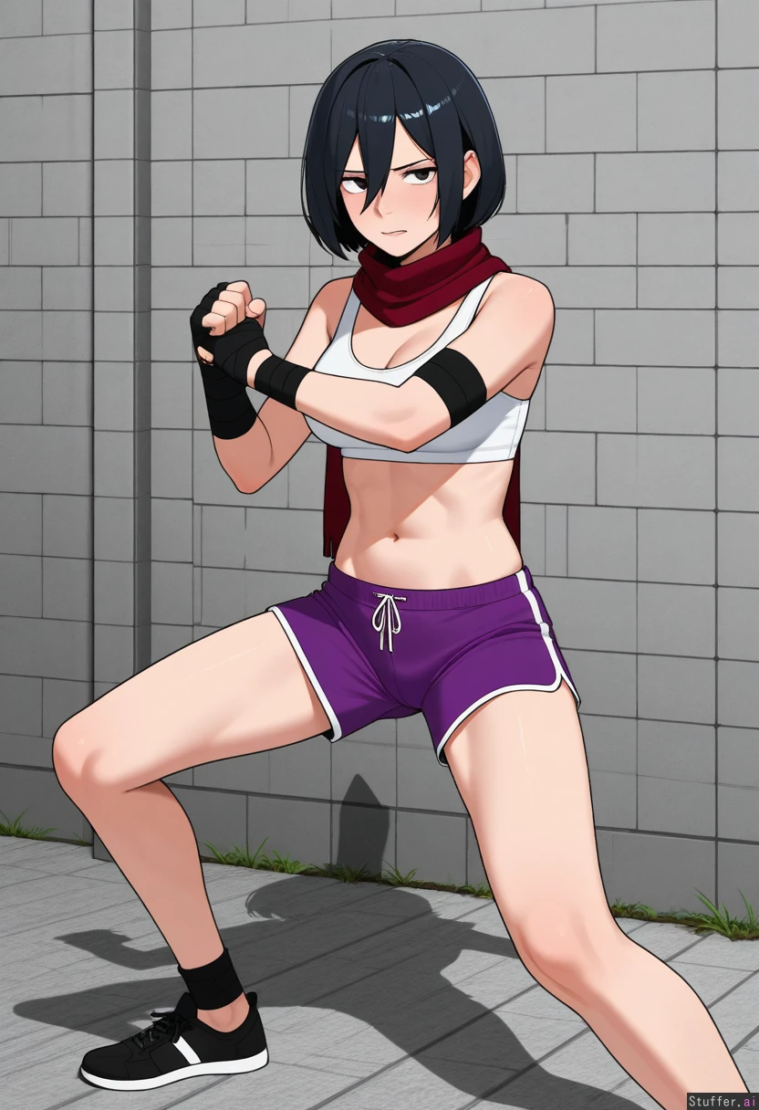 kipteitei, ohasi_art, spellsx, betterwithsalt, ((very detailed)) 1girl, (mikasa_ackerman), mature_female, wearing white sports bra, purple sport shorts and black hand wraps Outside, gray stone brick wall and floor, fighting_stance, shadow boxing She is skinny, fit, slim, lean, jacked, mascular with abs