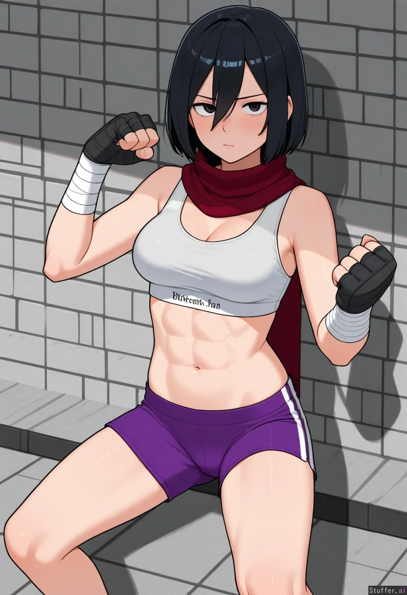 kipteitei, ohasi_art, spellsx, betterwithsalt, ((very detailed)) 1girl, (mikasa_ackerman), mature_female, wearing white sports bra, purple sport shorts and black hand wraps Outside, afternoon, gray stone brick wall and floor, fighting_stance, shadow boxing She is skinny, fit, slim, lean, jacked, mascular with abs