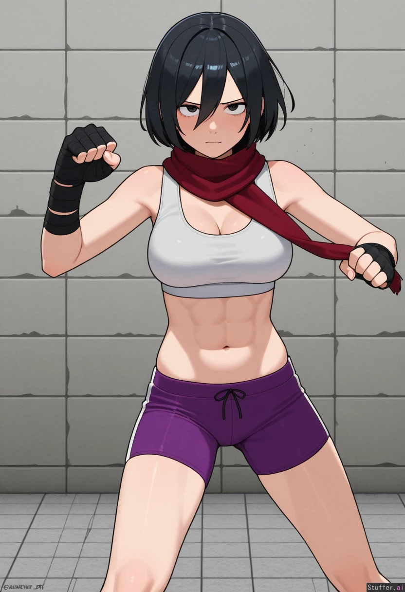 kipteitei, ohasi_art, spellsx, betterwithsalt, ((very detailed)) 1girl, solo, (mikasa_ackerman), mature_female, wearing white sports bra, purple sport shorts and black hand wraps Outside, afternoon, gray stone brick wall and floor, fighting_stance, standing, punching the air, focused expression, serious She is skinny, fit, slim, lean, jacked, mascular with abs