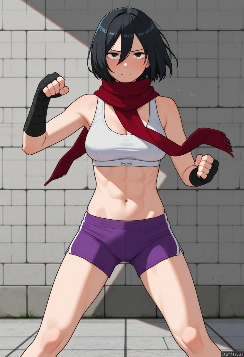 kipteitei, ohasi_art, spellsx, betterwithsalt, ((very detailed)) 1girl, solo, (mikasa_ackerman), mature_female, wearing white sports bra, purple sport shorts and black hand wraps Outside, afternoon, gray stone brick wall and floor, fighting_stance, standing, punching the air, focused expression, serious She is skinny, (fit), (slim), (lean), jacked, mascular with abs