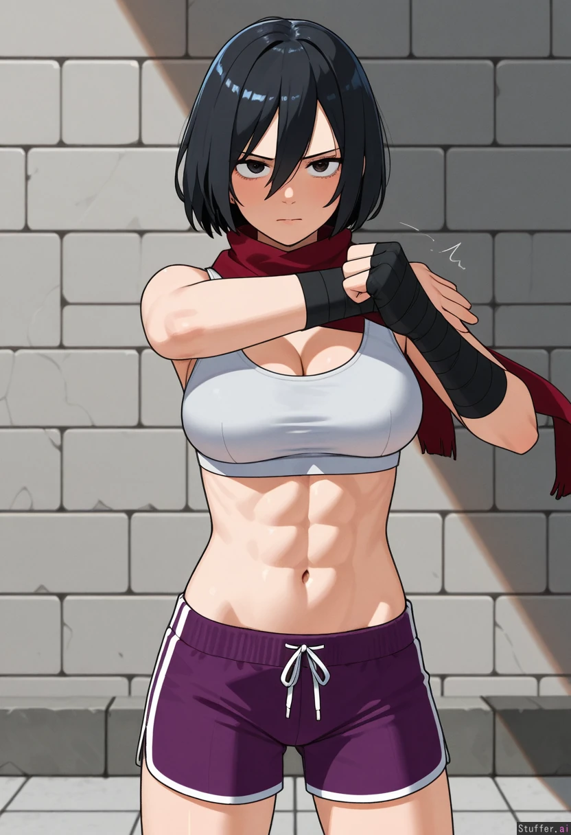 kipteitei, ohasi_art, spellsx, betterwithsalt, ((very detailed)) 1girl, solo, (mikasa_ackerman), mature_female, wearing white sports bra, purple shorts and black hand wraps Outside, afternoon, gray stone brick wall and floor, fighting_stance, standing, punching the air, focused expression, serious She is skinny, (fit), (slim), (lean), jacked, mascular with abs