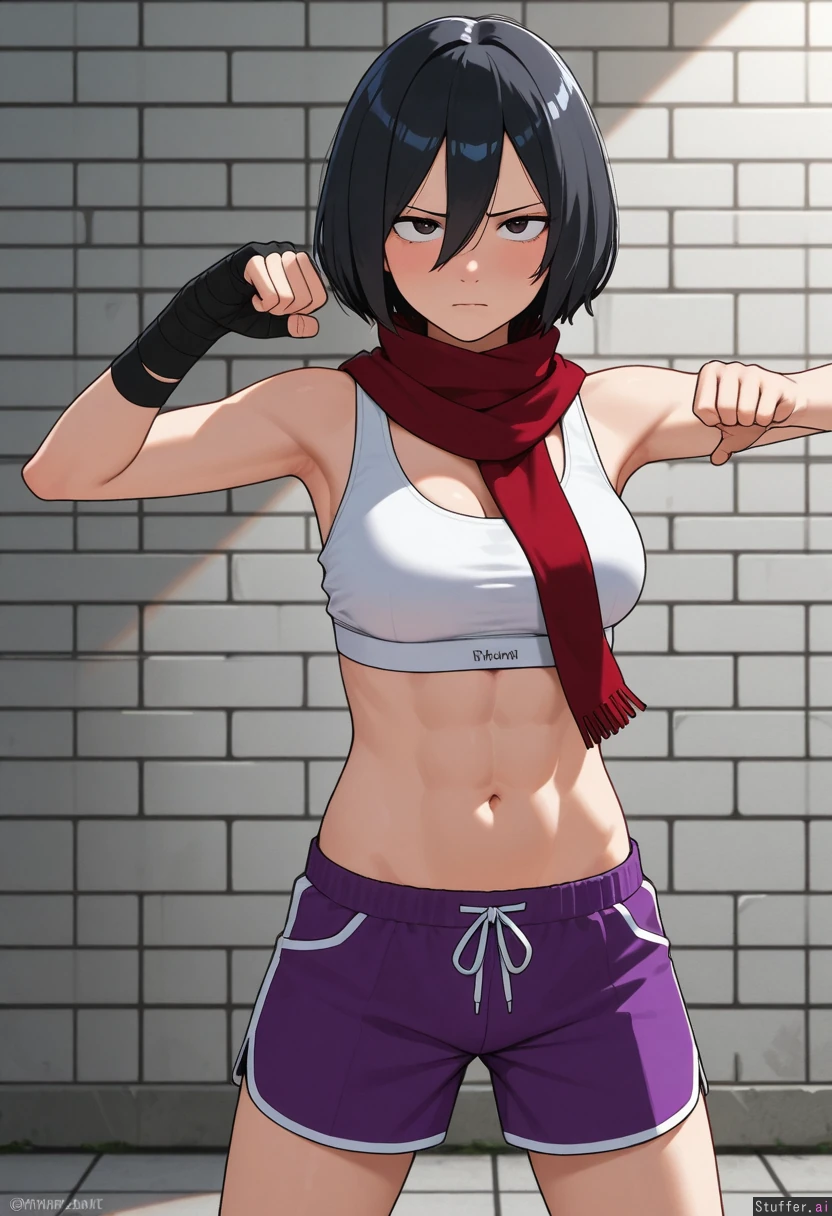 kipteitei, ohasi_art, spellsx, betterwithsalt, ((very detailed)) 1girl, solo, (mikasa_ackerman), mature_female, wearing white sports bra, purple shorts and black hand wraps Outside, afternoon, gray stone brick wall and floor, fighting_stance, standing, punching the air, working out, focused expression, serious She is skinny, (fit), (slim), (lean), jacked, mascular with abs