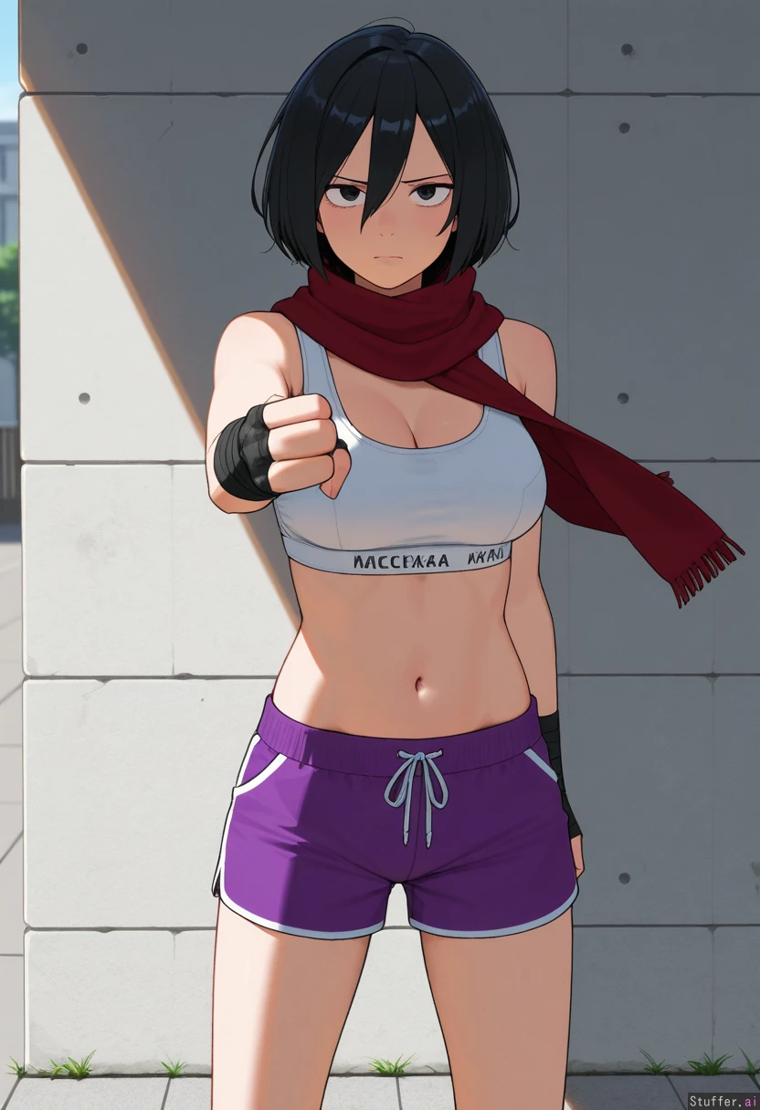 kipteitei, ohasi_art, spellsx, betterwithsalt, ((very detailed)) 1girl, solo, (mikasa_ackerman), mature_female, wearing white sports bra, purple shorts and black hand wraps Outside, afternoon, gray stone brick wall and floor, fighting_stance, standing, punching the air, working out, focused expression, serious She is thin, (fit), (slim), (lean), jacked, mascular