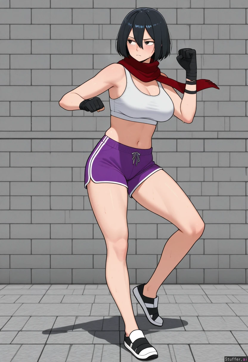 kipteitei, ohasi_art, spellsx, betterwithsalt, ((very detailed)) 1girl, solo, (mikasa_ackerman), mature_female, wearing white sports bra, purple shorts and black hand wraps Outside, afternoon, gray stone brick wall and floor, fighting_stance, standing, punching the air, working out, focused expression, serious, sweaty She is thin, (fit), (slim), (lean), jacked, mascular, thick thighs