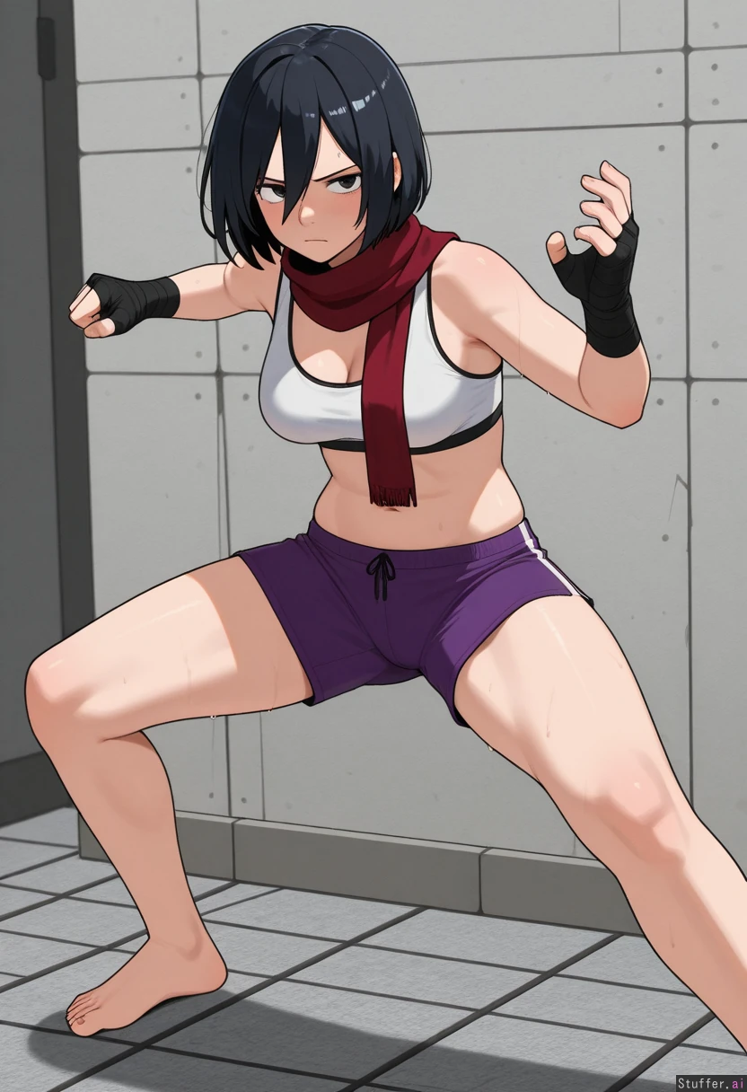kipteitei, ohasi_art, spellsx, betterwithsalt, ((very detailed)) 1girl, solo, (mikasa_ackerman), mature_female, wearing white sports bra, purple shorts and black hand wraps, bare foot Inside, afternoon, gray stone brick wall and floor, fighting_stance, standing, punching the air, working out, focused expression, serious, sweaty She is (fit), jacked, mascular, with medium breasts, thick thighs