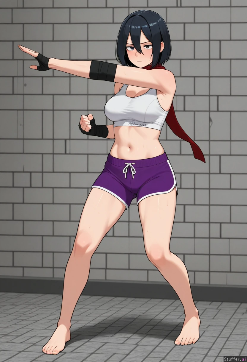 kipteitei, ohasi_art, spellsx, betterwithsalt, ((very detailed)) 1girl, solo, (mikasa_ackerman), mature_female, wearing white sports bra, purple shorts and black hand wraps, bare foot Inside, afternoon, gray stone brick wall and floor, fighting_stance, standing, punching the air, working out, focused expression, serious, sweaty She is (fit), jacked, mascular, with medium breasts, thick thighs