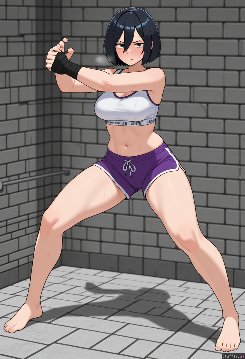kipteitei, ohasi_art, spellsx, betterwithsalt, ((very detailed)) 1girl, solo, (mikasa_ackerman), mature_female, wearing white sports bra, purple shorts and black hand wraps, bare foot Inside, afternoon, gray stone brick wall and floor, fighting_stance, standing, feeble punches, working out, exhausted expression, serious, sweaty, heavy breathing She is curvy, soft, with medium breasts, thick thighs, love handles