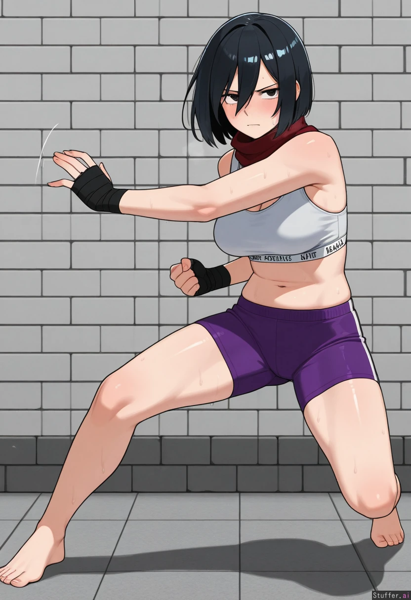 kipteitei, ohasi_art, spellsx, betterwithsalt, ((very detailed)) 1girl, solo, (mikasa_ackerman), mature_female, wearing white sports bra, purple shorts and black hand wraps, bare foot Inside, afternoon, gray stone brick wall and floor, fighting_stance, standing, feeble punches, working out, exhausted expression, serious, sweaty, heavy breathing She is curvy, soft, with medium breasts, thick thighs, love handles