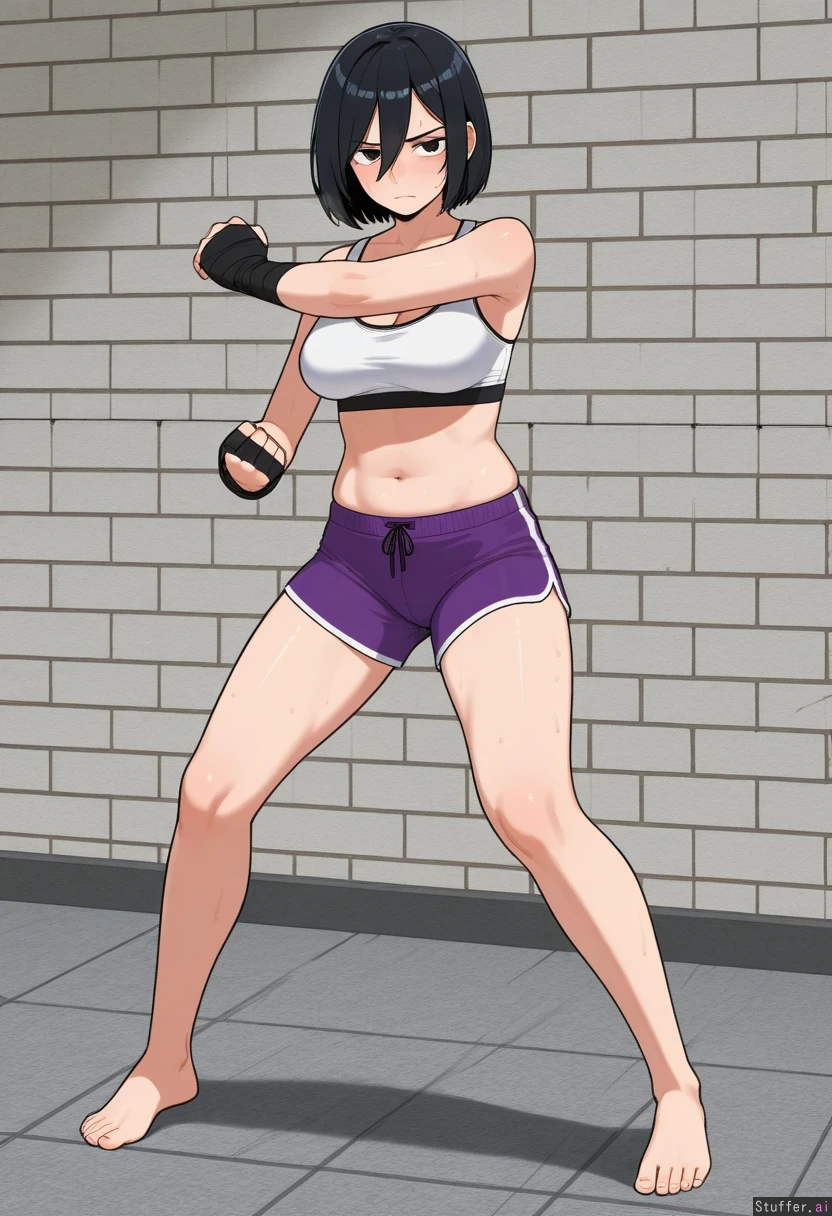 kipteitei, ohasi_art, spellsx, betterwithsalt, ((very detailed)) 1girl, solo, (mikasa_ackerman), mature_female, wearing white sports bra, purple shorts and black hand wraps, bare foot Inside, afternoon, gray stone brick wall and floor, fighting_stance, standing, feeble punches, working out, exhausted expression, serious, sweaty, heavy breathing She is curvy, soft, with medium breasts, thick thighs, love handles, muffin_top, flabby arms