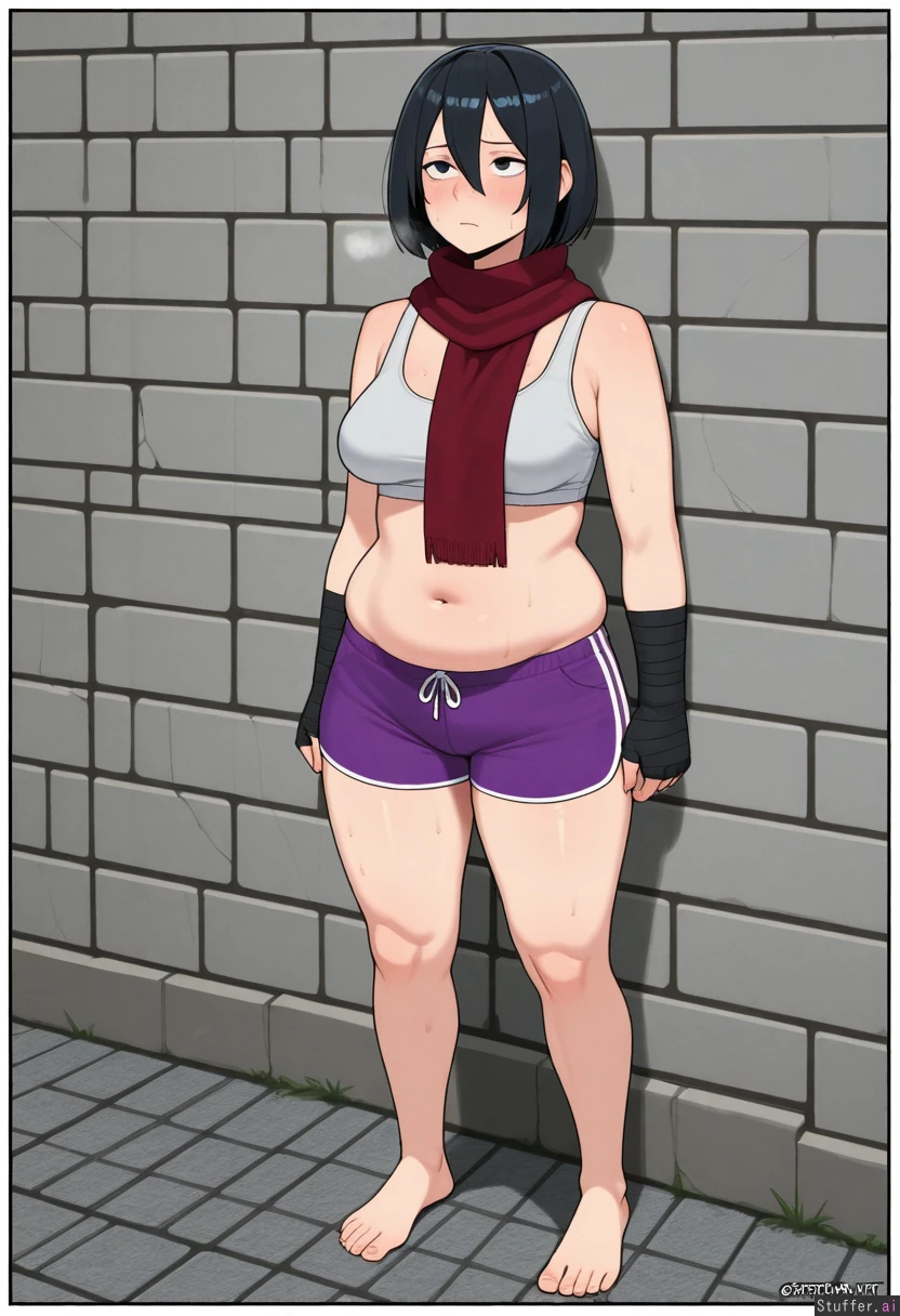 kipteitei, ohasi_art, spellsx, betterwithsalt, ((very detailed)) 1girl, solo, (mikasa_ackerman), mature_female, wearing white sports bra, purple shorts and black hand wraps, bare foot Inside, afternoon, gray stone brick wall and floor, hands on soft hips, looking up, exhausted expression, very sweaty, heavy breathing, out of breath She is curvy, soft, round, with medium breasts, thick thighs, love handles, muffin_top, flabby arms, soft meaty arms, soft belly