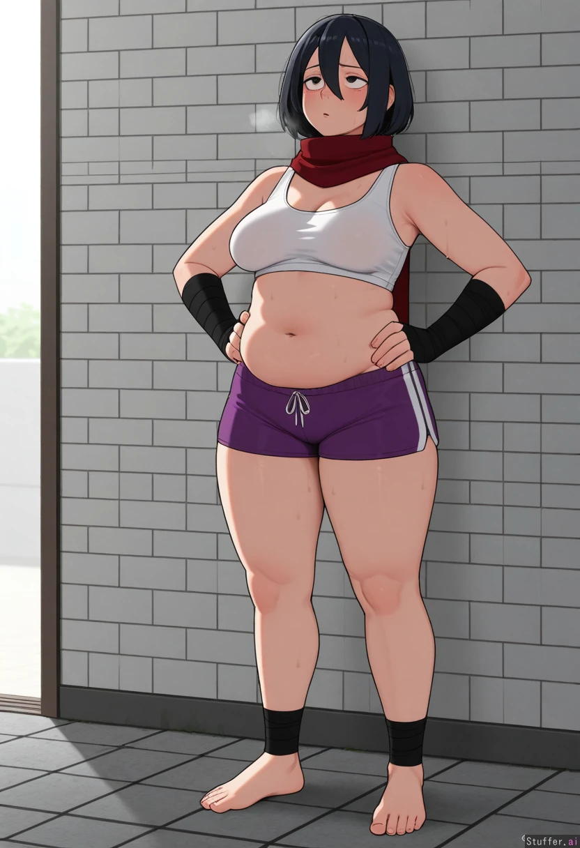 kipteitei, ohasi_art, spellsx, betterwithsalt, ((very detailed)) 1girl, solo, (mikasa_ackerman), mature_female, wearing white sports bra, purple shorts and black hand wraps, bare foot Inside, afternoon, gray stone brick wall and floor, hands on hips, looking up, exhausted expression, very sweaty, heavy breathing, out of breath, lazy She is curvy, soft, round, with medium breasts, thick thighs, love handles, muffin_top, big flabby arms, soft meaty arms, chubby fingers, chubby hips, soft belly