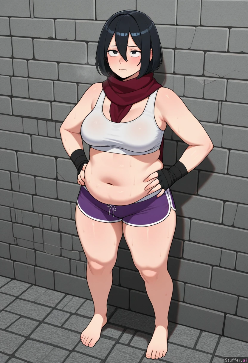 kipteitei, ohasi_art, spellsx, betterwithsalt, ((very detailed)) 1girl, solo, (mikasa_ackerman), mature_female, wearing white sports bra, purple shorts and black hand wraps, bare foot Inside, afternoon, gray stone brick wall and floor, hands on hips, looking up, exhausted expression, very sweaty, heavy breathing, out of breath, lazy She is curvy, soft, round, chubby, with medium breasts, thick thighs, love handles, muffin_top, big flabby arms, soft meaty arms, chubby fingers, chubby hips, round soft belly