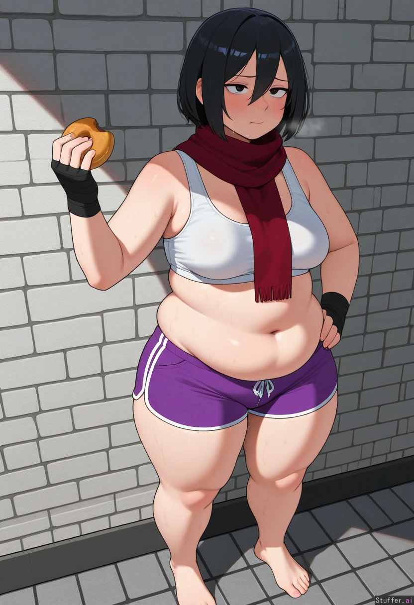 kipteitei, ohasi_art, spellsx, betterwithsalt, ((very detailed)) 1girl, solo, (mikasa_ackerman), mature_female, wearing white sports bra, purple shorts and black hand wraps, bare foot Inside, afternoon, gray stone brick wall and floor, hand on hip, exhausted expression, very sweaty, heavy breathing, out of breath, lazy, eating a donut She is curvy, soft, round, chubby, with medium breasts, thick thighs, chubby thighs, love handles, muffin_top, big flabby arms, soft meaty arms, chubby fingers, chubby hips, fat face, double chin, round fat belly, belly hang