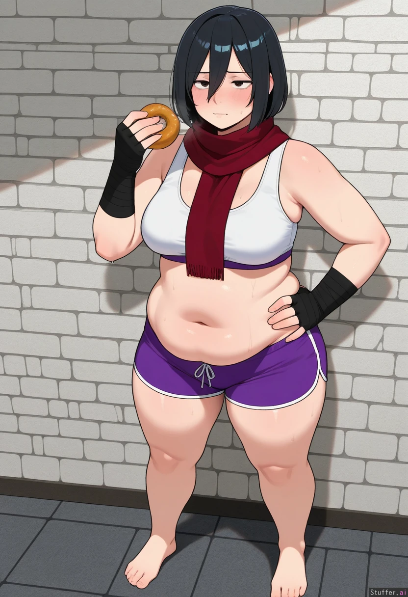 kipteitei, ohasi_art, spellsx, betterwithsalt, ((very detailed)) 1girl, solo, (mikasa_ackerman), mature_female, wearing white sports bra, purple shorts and black hand wraps, bare foot Inside, afternoon, gray stone brick wall and floor, hand on hip, exhausted expression, very sweaty, heavy breathing, out of breath, lazy, eating a donut She is curvy, soft, round, chubby, with medium breasts, thick thighs, chubby thighs, love handles, muffin_top, big flabby arms, fat meaty arms, chubby fingers, chubby hips, fat face, double chin, round fat belly, belly hang