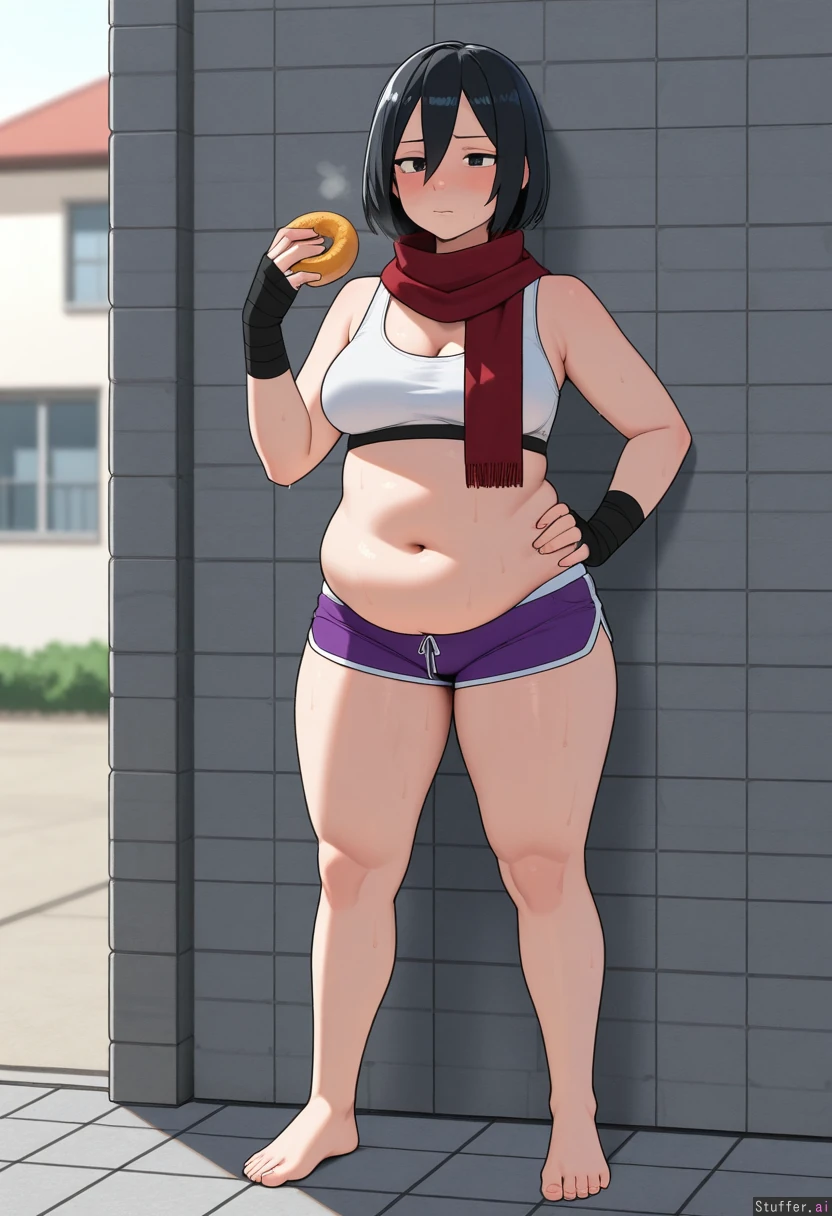 kipteitei, ohasi_art, spellsx, betterwithsalt, ((very detailed)) 1girl, solo, (mikasa_ackerman), mature_female, wearing white sports bra, purple shorts and black hand wraps, bare foot Inside, afternoon, gray stone brick wall and floor, hand on hip, exhausted expression, disappointed, very sweaty, heavy breathing, out of breath, lazy, eating a donut She is curvy, soft, round, overweight, with medium breasts, thick thighs, chubby thighs, love handles, muffin_top, big flabby arms, fat meaty arms, chubby fingers, fat hips, fat face, double chin, round fat belly, belly hang