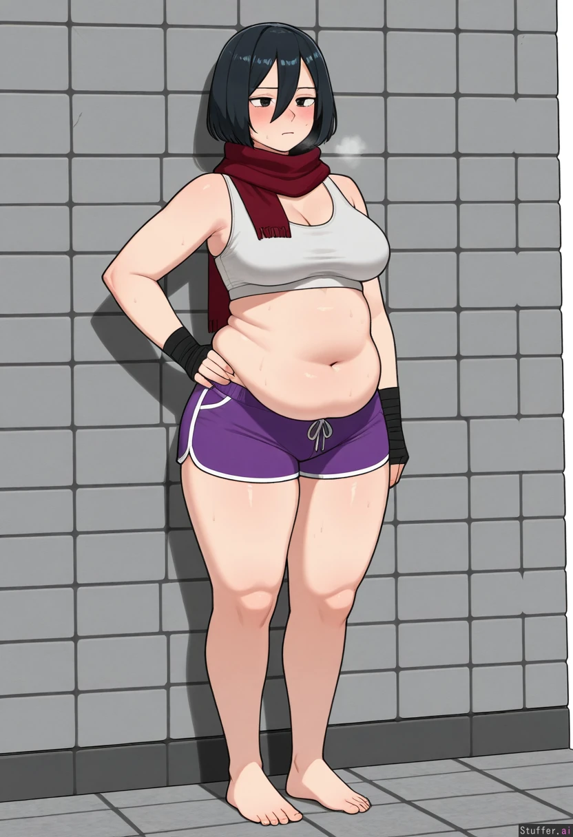 kipteitei, ohasi_art, spellsx, betterwithsalt, ((very detailed)) 1girl, solo, (mikasa_ackerman), mature_female, wearing white sports bra, purple shorts and black hand wraps, bare foot Inside, afternoon, gray stone brick wall and floor, hand on hip, exhausted expression, disappointed, very sweaty, heavy breathing, out of breath, lazy, eating a donut She is curvy, soft, round, overweight, with medium breasts, thick thighs, chubby thighs, love handles, muffin_top, big flabby arms, fat meaty arms, chubby fingers, fat hips, fat face, double chin, round fat belly, belly hang from_below