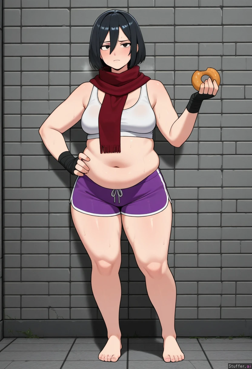 kipteitei, ohasi_art, spellsx, betterwithsalt, ((very detailed)) 1girl, solo, (mikasa_ackerman), mature_female, wearing white sports bra, purple shorts and black hand wraps, bare foot Inside, afternoon, gray stone brick wall and floor, hand on hip, exhausted expression, disappointed, very sweaty, heavy breathing, out of breath, lazy, eating a donut She is curvy, soft, round, overweight, with medium breasts, thick thighs, chubby thighs, love handles, muffin_top, big flabby arms, fat meaty arms, chubby fingers, fat_arms, fat hips, fat face, double chin, round fat belly, belly hang from_below