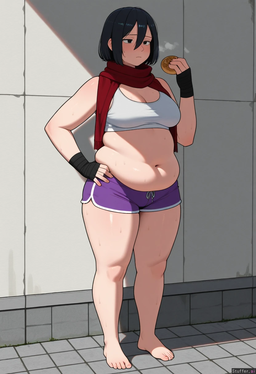 kipteitei, ohasi_art, spellsx, betterwithsalt, ((very detailed)) 1girl, solo, (mikasa_ackerman), mature_female, wearing white sports bra, purple shorts and black hand wraps, bare foot Inside, afternoon, gray stone brick wall and floor, hand on hip, exhausted expression, disappointed, very sweaty, heavy breathing, out of breath, lazy, eating a donut She is curvy, soft, round, overweight, with medium breasts, thick thighs, chubby thighs, love handles, muffin_top, big flabby arms, fat meaty arms, chubby fingers, fat_arms, fat hips, fat face, double chin, round fat belly, belly hang from_below