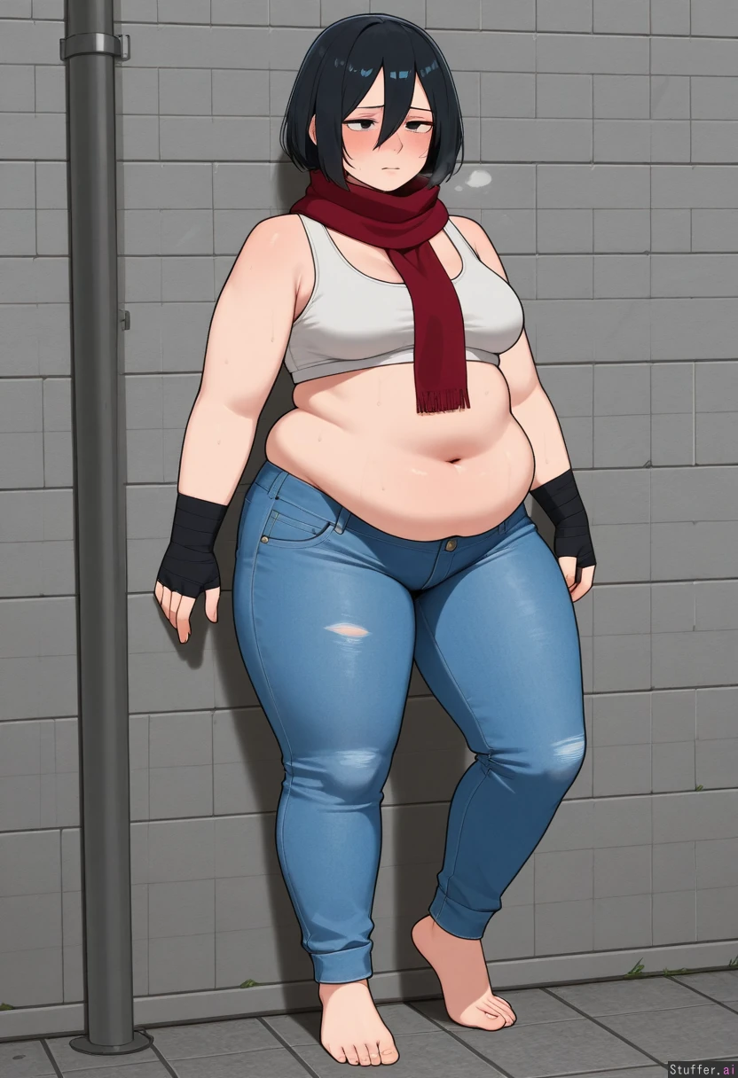 kipteitei, ohasi_art, spellsx, betterwithsalt, ((very detailed)) 1girl, solo, (mikasa_ackerman), mature_female, wearing white sports bra, white underwear and black hand wraps, bare foot Inside, afternoon, gray stone brick wall and floor, exhausted expression, disappointed, very sweaty, heavy breathing, out of breath, lazy, trying to put on jeans She is curvy, soft, round, overweight, obese with medium breasts, thick thighs, chubby thighs, love handles, muffin_top, big flabby arms, fat meaty arms, chubby fingers, fat_arms, fat hips, (fat face), (double chin), round fat belly, belly hang from_below