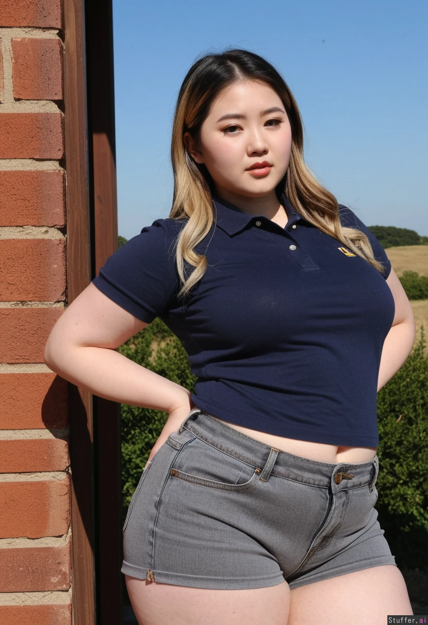 Hyper realistic, extremely beautiful 19 year old korean supermodel, preppy country girl, dark hair dyed with blonde highlights, sunny day, country photoshoot (front view), showing off for the camera, Set((Grey Jean shorts), (Preppy navy polo top)), ((Wide hips)), (plump), (fat_belly), female, curvaceous, thick_thighs, bbw, bottomheavy, plump