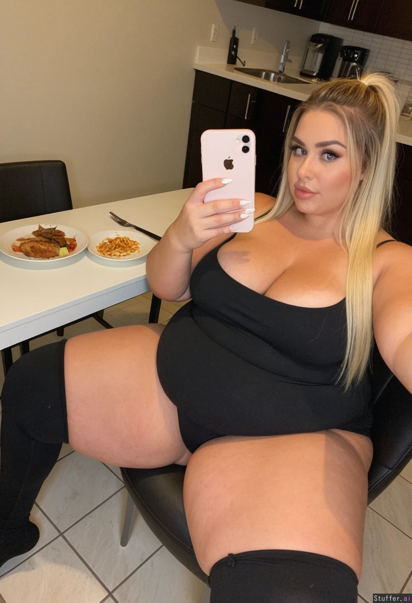 25 year old woman, messy fancy blonde hair, extreme beautiful model slim face, caucasian, long straight hair, blushes, tan skin, perfect Makeup, ((huge cleavage:)), (oversized black leggings, tube top:) ((huge wide hips, massive thick thighs:1 )), ((fat bulging belly:)), (Big butt:)),(((sitting on chair at dinner table taking sexy selfie in modern kitchen))), ((long white nails)), ((full body view from above))