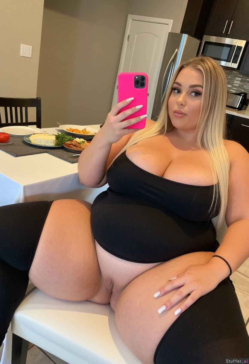 25 year old woman, messy fancy blonde hair, extreme beautiful model slim face, caucasian, long straight hair, blushes, tan skin, perfect Makeup, ((huge cleavage:)), (oversized black leggings, tube top:) ((huge wide hips, massive thick thighs:1 )), ((gigantic fat bulging belly:)), (Big butt:)),(((sitting on chair at dinner table taking sexy selfie in modern kitchen))), ((long white nails)), ((full body view from above)), ((giant blob of a woman:))