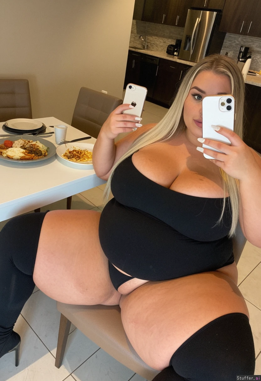 25 year old woman, messy fancy blonde hair, extreme beautiful model slim face, caucasian, long straight hair, blushes, tan skin, perfect Makeup, ((huge cleavage:)), (oversized black leggings, tube top:) ((huge wide hips, massive thick thighs:1 )), ((gigantic fat bulging belly:1.2)), (Big butt:)),(((sitting on chair at dinner table taking sexy selfie in modern kitchen))), ((long white nails)), ((full body view from above)), ((giant blob of a woman:1.2))