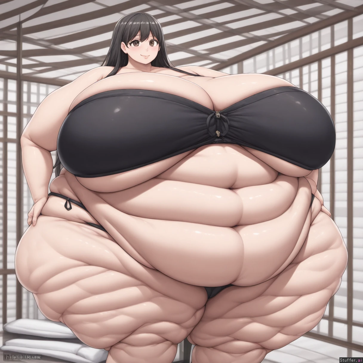 **base** absurdres, best_shading, warm_lighting, best_quality, masterpiece, solo, high_resolution, high_rating, remove_watermark **artist** (Wtjjune) **character** mari(omori), sitting, holding_belly, aroused, teasing, horny, blushing, **settings** rear_view, dappled sunlight, home, **clothes** (tight_black_sexy_bra), (tight_black_sexy_thong), **body** (Tall:1.4), long_legs, ((Wide_hips), (gigantic_breasts), (morbidly_obese_female), (gigantic_round_belly), (love_handles), (cellulite), (Fat_arms), (fat_legs), :1.4)