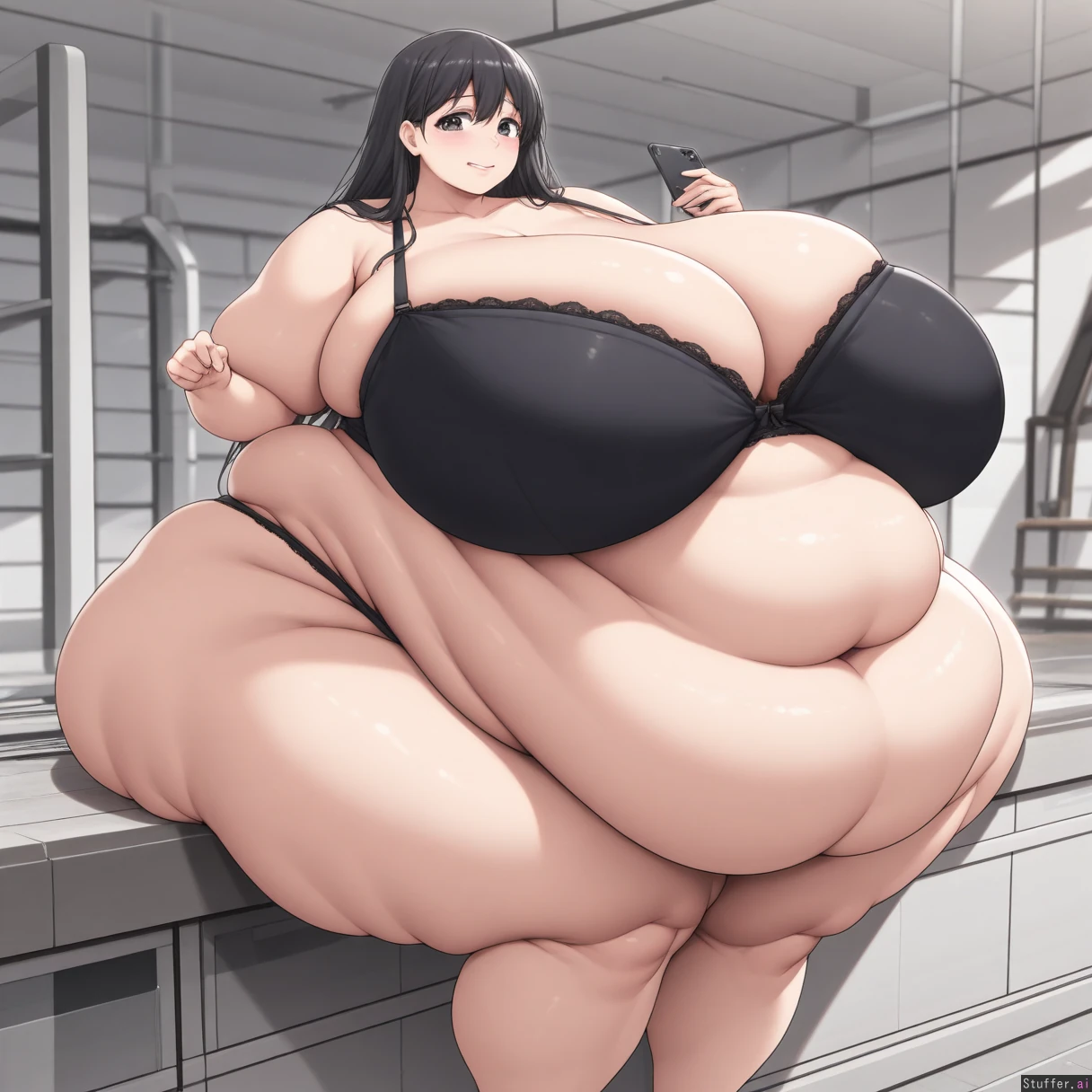 **base** absurdres, best_shading, warm_lighting, best_quality, masterpiece, solo, high_resolution, high_rating, remove_watermark **artist** (Wtjjune) **character** mari(omori), sitting, holding_belly, aroused, teasing, horny, blushing, **settings** rear_view, dappled sunlight, home, **clothes** (tight_black_sexy_bra), (tight_black_sexy_thong), **body** (Tall:1.4), long_legs, ((Wide_hips), (gigantic_breasts), (morbidly_obese_female), (gigantic_round_belly), (love_handles), (cellulite), (Fat_arms), (fat_legs), :1.3)
