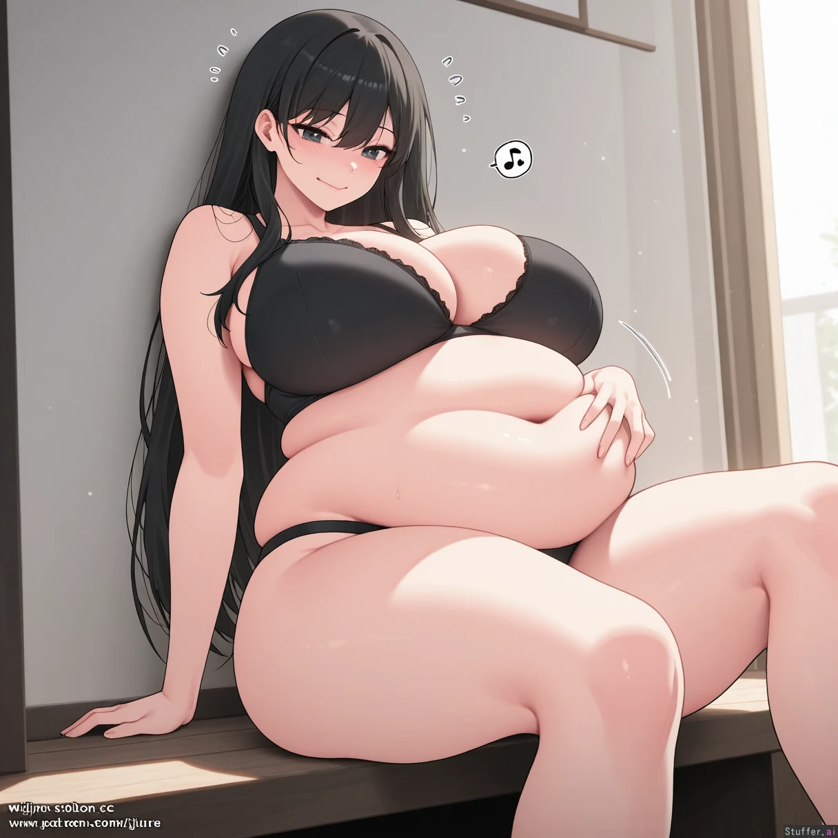 **base** absurdres, best_shading, warm_lighting, best_quality, masterpiece, solo, high_resolution, high_rating, remove_watermark **artist** (Wtjjune) **character** mari(omori), sitting, holding_belly, aroused, teasing, horny, blushing, **settings** rear_view, dappled sunlight, home, **clothes** (tight_black_sexy_bra), (tight_black_sexy_thong), **body** (Tall:1.4), long_legs, ((Wide_hips), (gigantic_breasts), (morbidly_obese_female), (gigantic_round_belly), (love_handles), (cellulite), (Fat_arms), (fat_legs), :0.89)