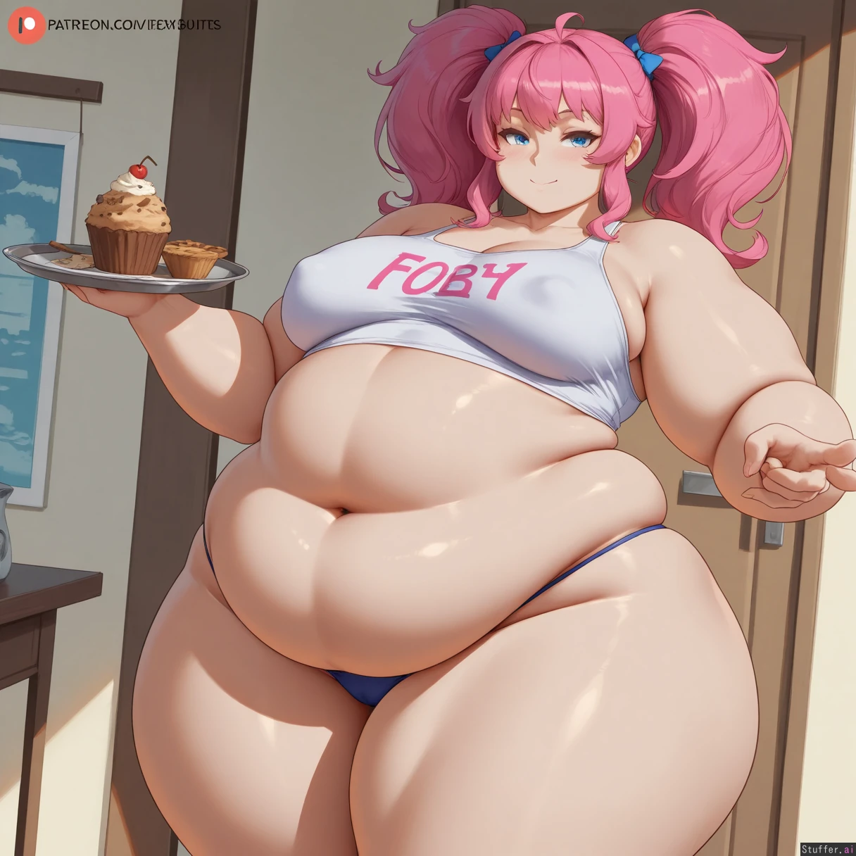 cutesexyrobutts, coffeeslice, (obese:1.5), (chubby belly:1.9), (thick thighs:2), (wide hips:2), pale skin, blue_eyes, human, perfect human anatomy, medium breasts, (fat arms:1.4), pink hair, milf, araneesama, panties, crop top, (chubby face:1.1), looking_at_viewer, dessert, (blushing), smile, pigtails, muffin_top, love_handles, (flabby), greedy, feedee, weight_gain, (cellulite), hanging_belly, stretch_marks