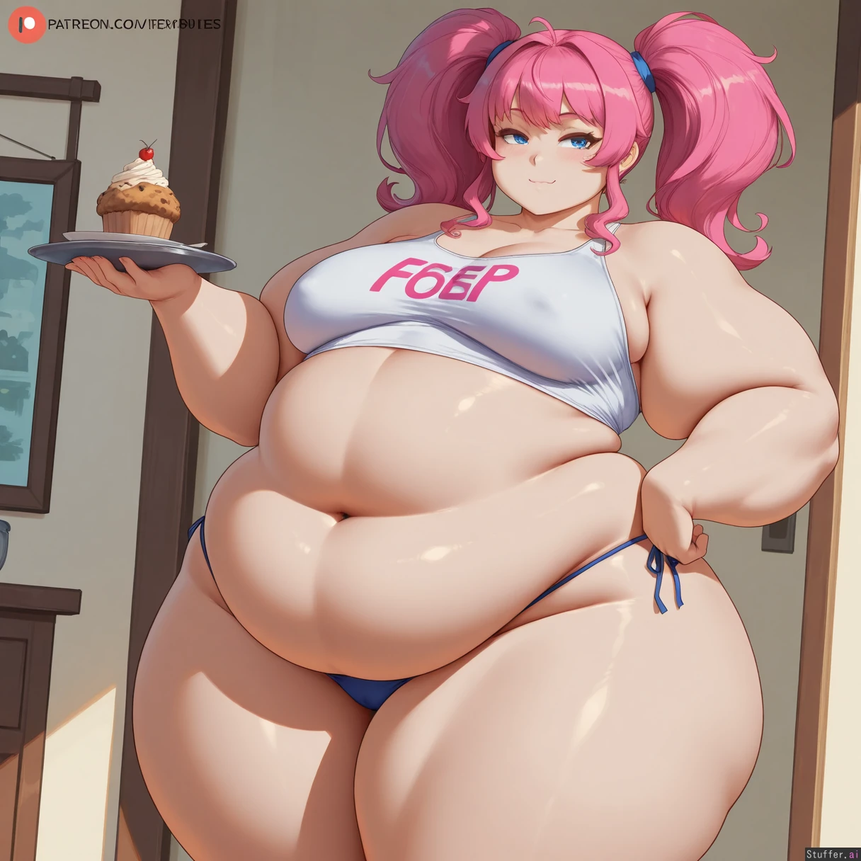 cutesexyrobutts, coffeeslice, (obese:1.6), (chubby belly:1.9), (thick thighs:2), (wide hips:2), pale skin, blue_eyes, human, perfect human anatomy, medium breasts, (fat arms:1.4), pink hair, milf, araneesama, panties, crop top, (chubby face:1.1), looking_at_viewer, dessert, (blushing), smile, pigtails, muffin_top, love_handles, (flabby), greedy, feedee, weight_gain, (cellulite), hanging_belly, stretch_marks