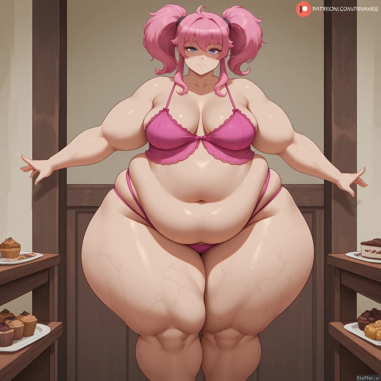 cutesexyrobutts, coffeeslice, (obese:1.0), (chubby belly:1.5), (fat legs:2.4), (wide hips:2), pale skin, blue_eyes, human, perfect human anatomy, medium breasts, (fat arms:1.4), pink hair, milf, araneesama, (chubby face:1.1), looking_at_viewer, dessert, (blushing), smile, pigtails, muffin_top, love_handles, ((flabby)), greedy, feedee, weight_gain, (cellulite), hanging_belly, stretch_marks, lingerie