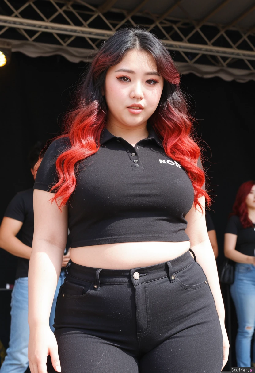 Hyper realistic, ((solo woman)), stunning baddie face detail, raver, pretty 20 year old korean model, wavy dark long hair with red highlights, quirky, very chinky Korean eyes, music festival, sunny day, ((front view)), excited, having fun, (Black mid waist work jeans), (Plain black cropped polo), ((Wide hips)), fat, female , thighs, perfect overweight plus size body, very body positive