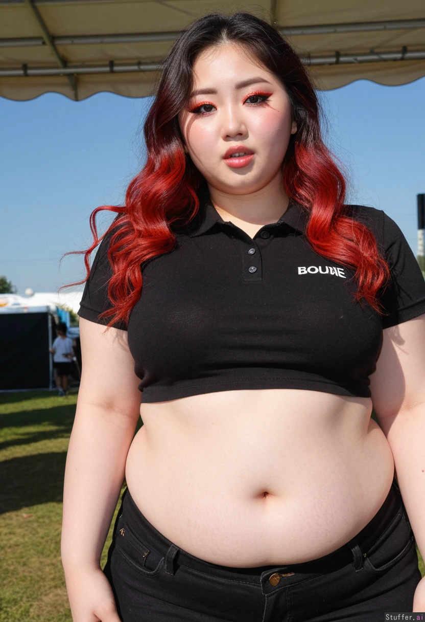 Hyper realistic, ((solo woman)), stunning baddie face detail, raver, pretty 20 year old korean model, wavy dark long hair with red highlights, quirky, very chinky Korean eyes, music festival, sunny day, ((front view)), excited, having fun, (Black mid waist work jeans), (Plain black cropped polo), ((Wide hips)), fat, female , thighs, perfect overweight plus size body, very body positive