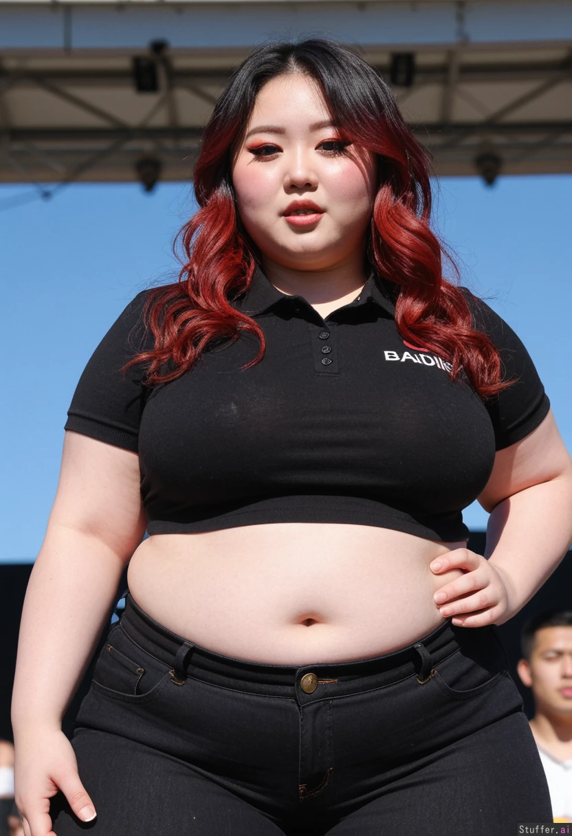 Hyper realistic, ((solo woman)), stunning baddie face detail, raver, pretty 20 year old korean plus size model, wavy dark long hair with red highlights, quirky, very chinky Korean eyes, music festival, sunny day, ((front view)), excited, having fun, (Black mid waist work jeans), (Plain black cropped polo), ((Wide hips)), fat, female , thighs, perfect overweight plus size body, very body positive