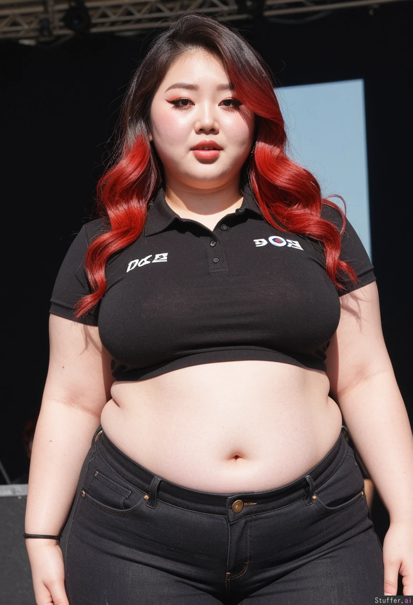 Hyper realistic, ((solo woman)), stunning baddie face detail, raver, pretty 20 year old korean plus size model, wavy dark long hair with red highlights, quirky, very chinky Korean eyes, music festival, sunny day, ((front view)), excited, having fun, (Black mid waist work jeans), (Plain black cropped polo), ((Wide hips)), fat, female , thighs, perfect overweight plus size body, very body positive