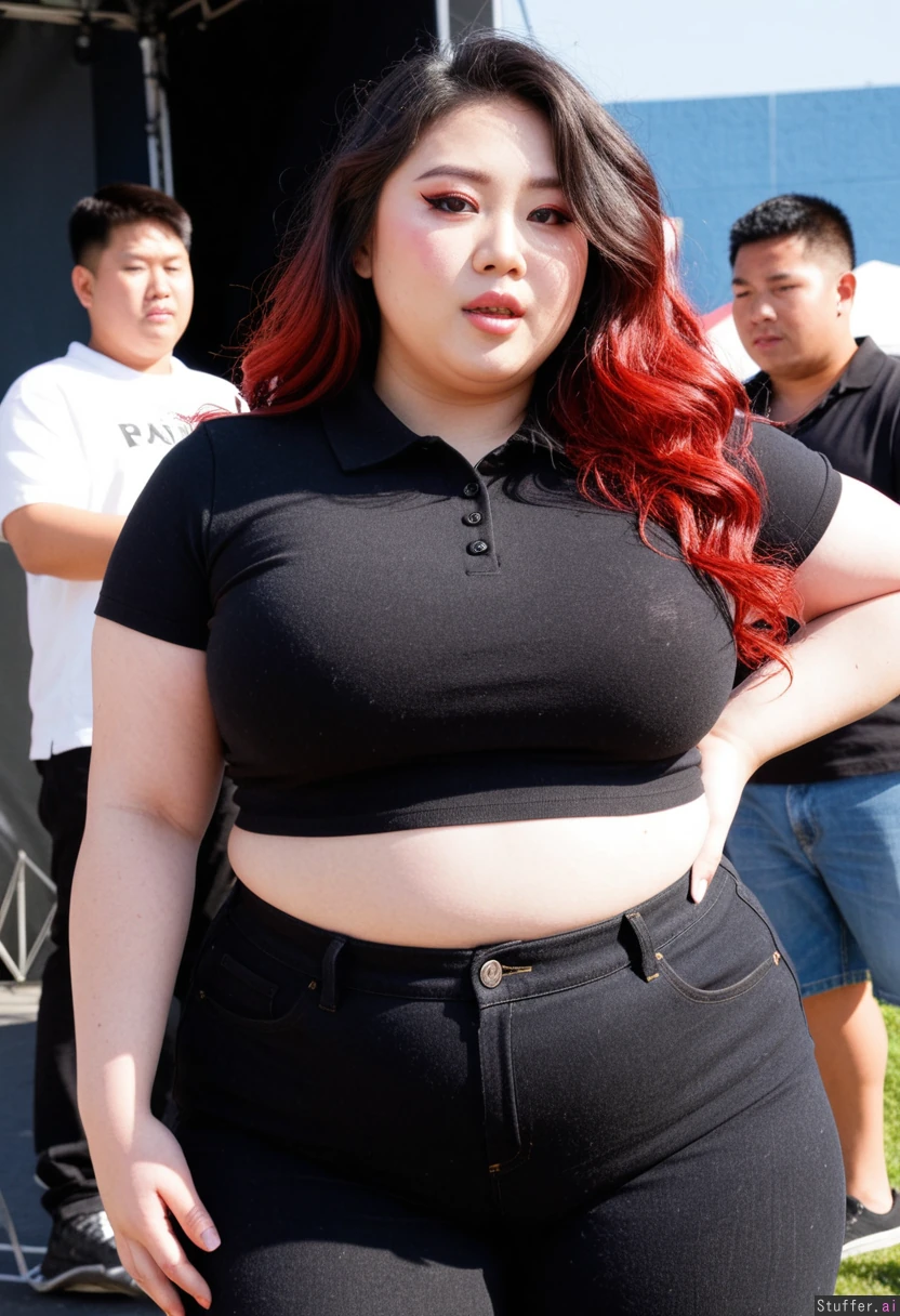 Hyper realistic, ((solo woman)), stunning baddie face detail, raver, pretty 20 year old korean plus size model, wavy dark long hair with red highlights, quirky, very chinky Korean eyes, music festival, sunny day, ((front view)), excited, having fun, (Black mid waist work jeans), (Plain black cropped polo), ((Wide hips)), fat, female , thighs, perfect overweight plus size body, very body positive