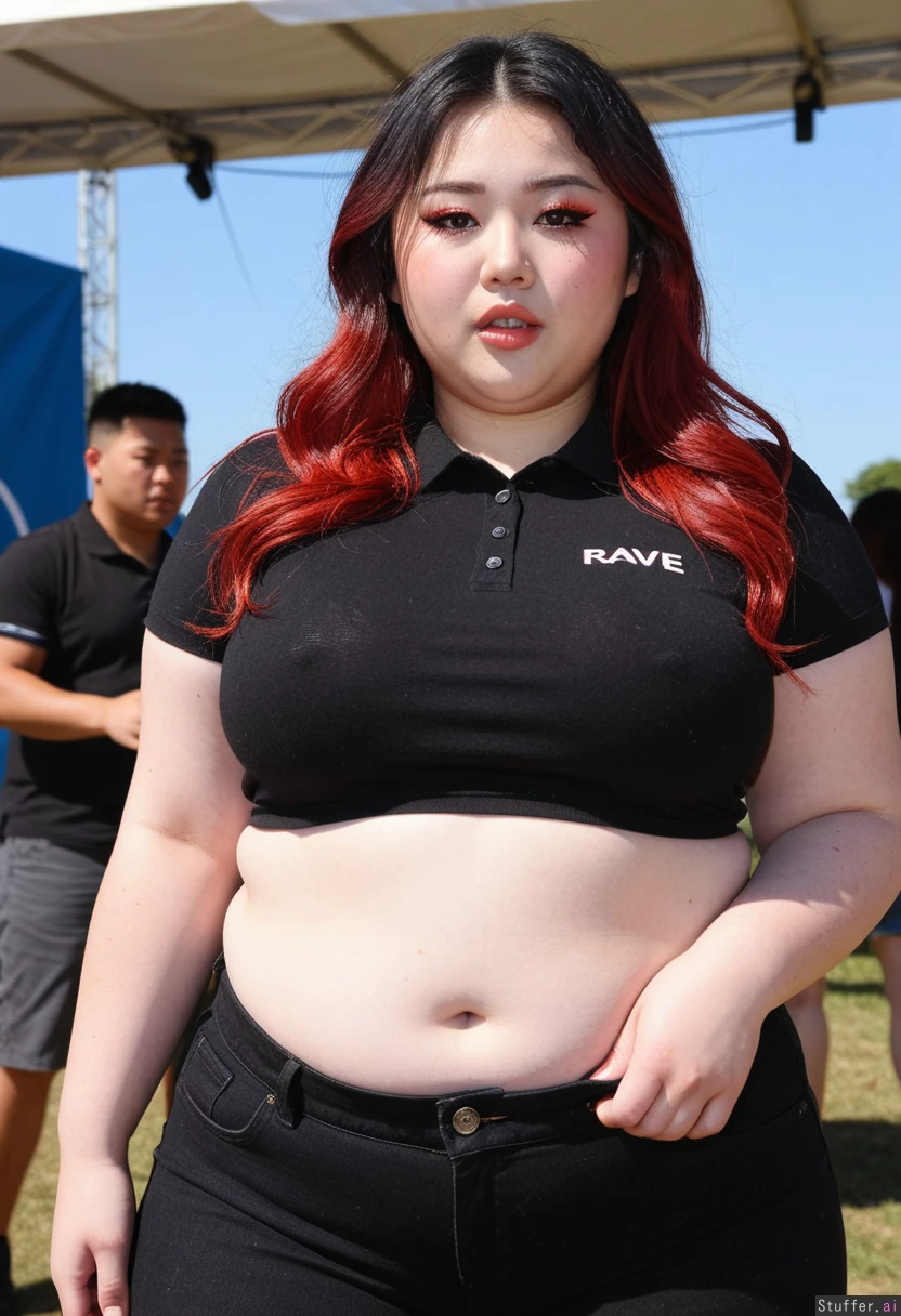 Hyper realistic, ((solo woman)), stunning baddie face detail, raver, pretty 20 year old korean plus size model, wavy dark long hair with red highlights, quirky, very chinky Korean eyes, music festival, sunny day, ((front view)), excited, having fun, (Black mid waist work jeans), (Plain black cropped polo), ((Wide hips)), fat, female , thighs, perfect overweight plus size body, very body positive, sharp defined face,