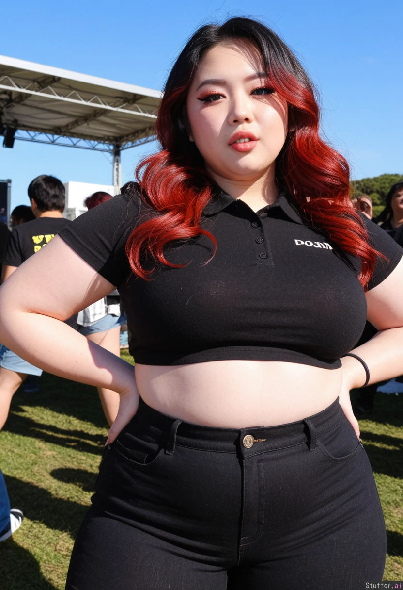 Hyper realistic, ((solo woman)), stunning baddie face detail, raver, pretty 20 year old korean plus size model, wavy dark long hair with red highlights, quirky, very chinky Korean eyes, music festival, sunny day, ((front view)), excited, having fun, (Black mid waist work jeans), (Plain black cropped polo), ((Wide hips)), fat, female , thighs, perfect overweight plus size body, very body positive, sharp defined face,