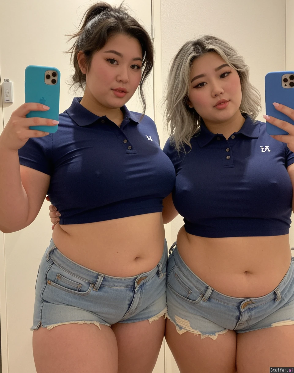 Body: pretty face, plus size supermodels, ((overweight)), ((((fat)))), pretty, 19, hot stunning face detail, (twins), Outfit: ((navy polo crop top)), light gray Jean shorts, modest, Pose: inviting, enjoying each other , baddest bitches, Location: bathroom, (Two korean lesbian plump women filming a hot tiktok), messy tousled hair, dark super short hair, plump