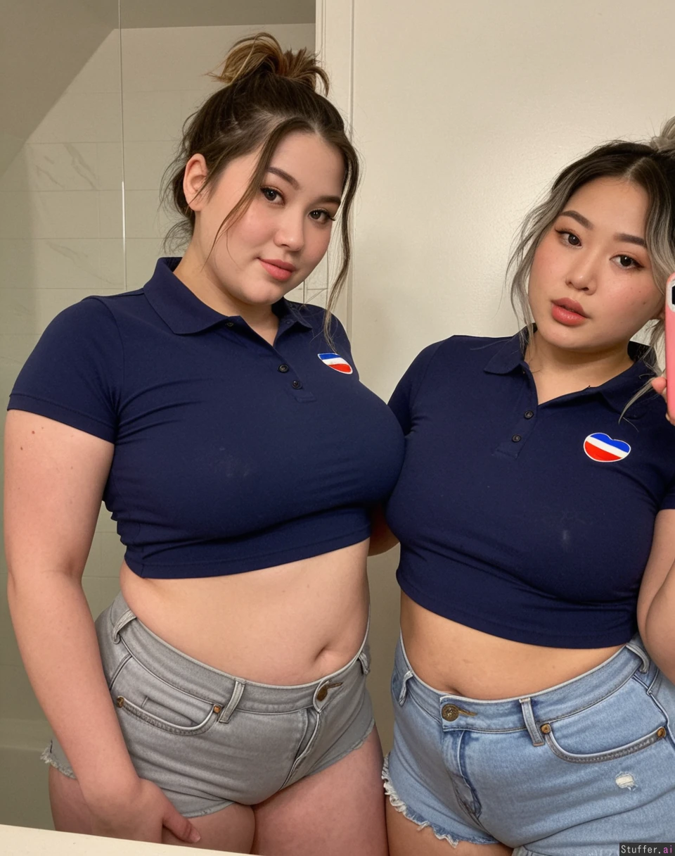 Body: pretty face, plus size supermodels, (overweight), (fat), pretty, 19, hot stunning face detail, (twins), Outfit: ((navy polo crop top)), light gray Jean shorts, modest, Pose: inviting, enjoying each other , baddest bitches, Location: bathroom, (Two korean lesbian plump women filming a hot tiktok), messy tousled hair, dark super short hair,