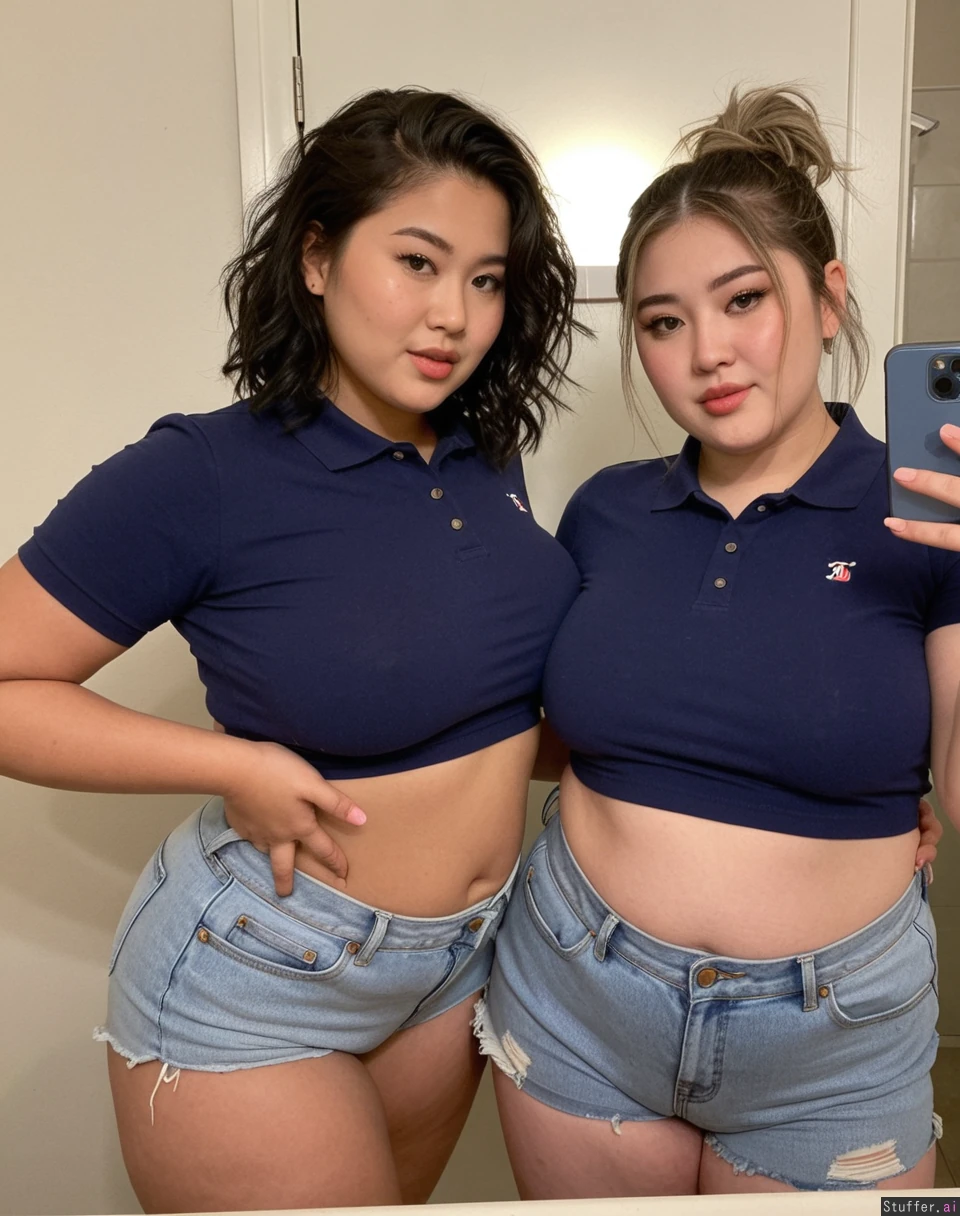 Body: pretty face, plus size supermodels, (overweight), (fat), pretty, 19, hot stunning face detail, (twins), Outfit: ((navy polo crop top)), light gray Jean shorts, modest, Pose: inviting, enjoying each other , baddest bitches, stoic, Location: bathroom, (Two korean lesbian plump women filming a hot tiktok), messy tousled hair, dark super short hair,