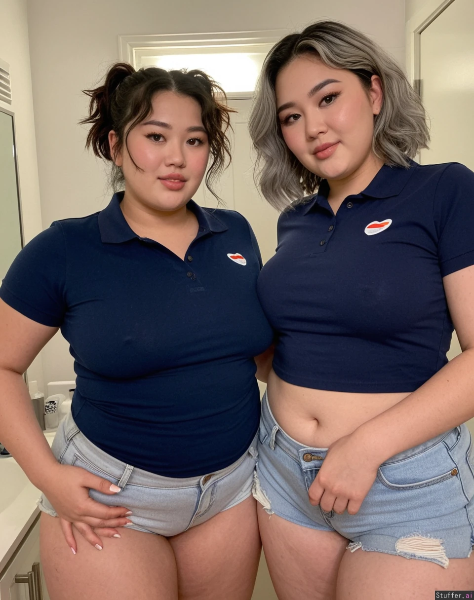 Body: pretty face, plus size supermodels, (overweight), (fat), pretty, 19, hot stunning face detail, (twins), Outfit: ((navy polo top)), light gray Jean shorts, modest, Pose: inviting, enjoying each other , baddest bitches, stoic, Location: bathroom, (Two korean plump women filming a hot tiktok), messy tousled hair, dark super short hair,