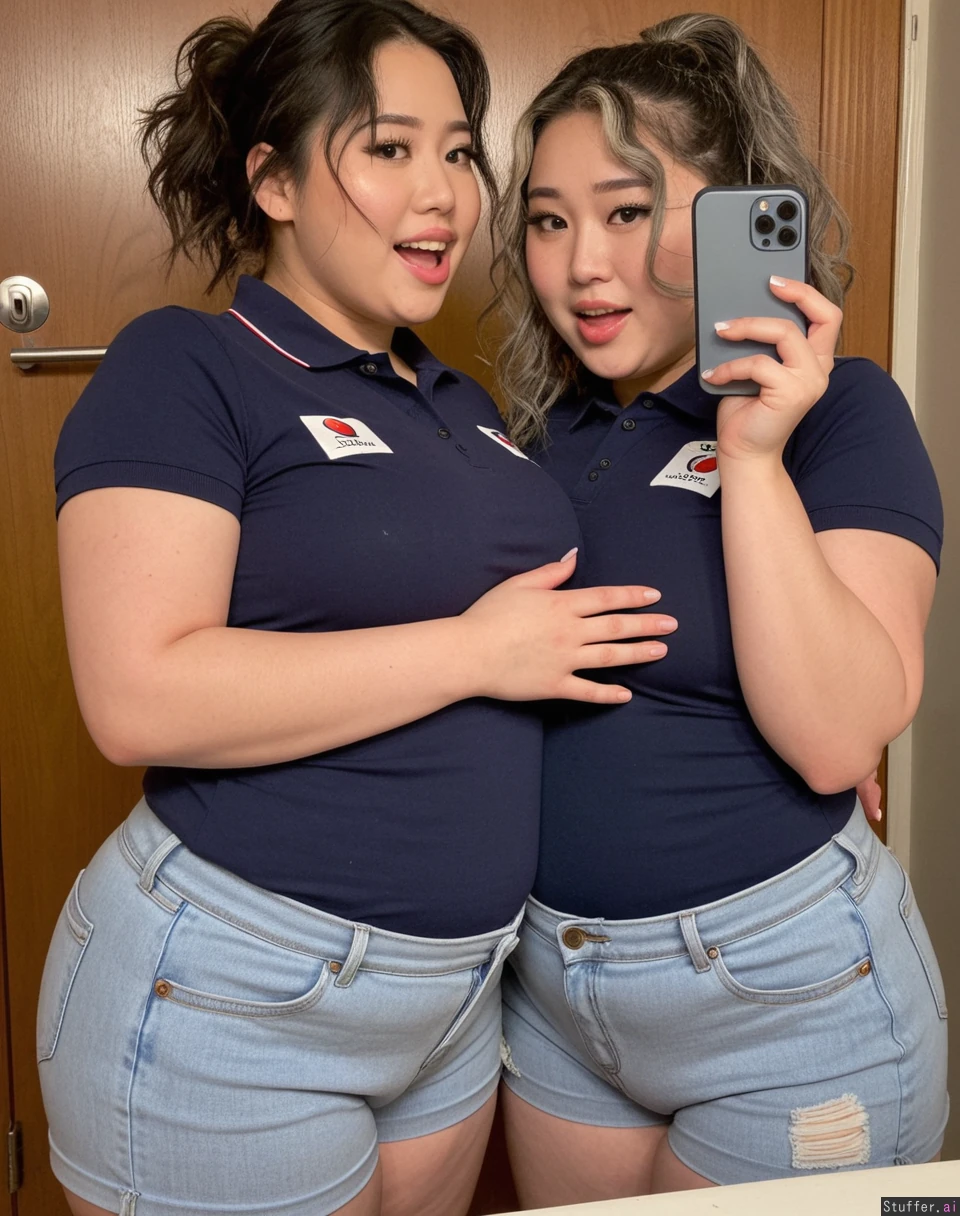 Body: pretty face, plus size supermodels, (overweight), (fat), pretty, 19, hot stunning face detail, (twins), Outfit: ((navy polo top)), light gray Jean shorts, modest, uniform Pose: inviting, enjoying each other , baddest bitches, stoic, Location: bathroom, (Two korean plump women filming a hot tiktok), messy tousled hair, dark super short hair,