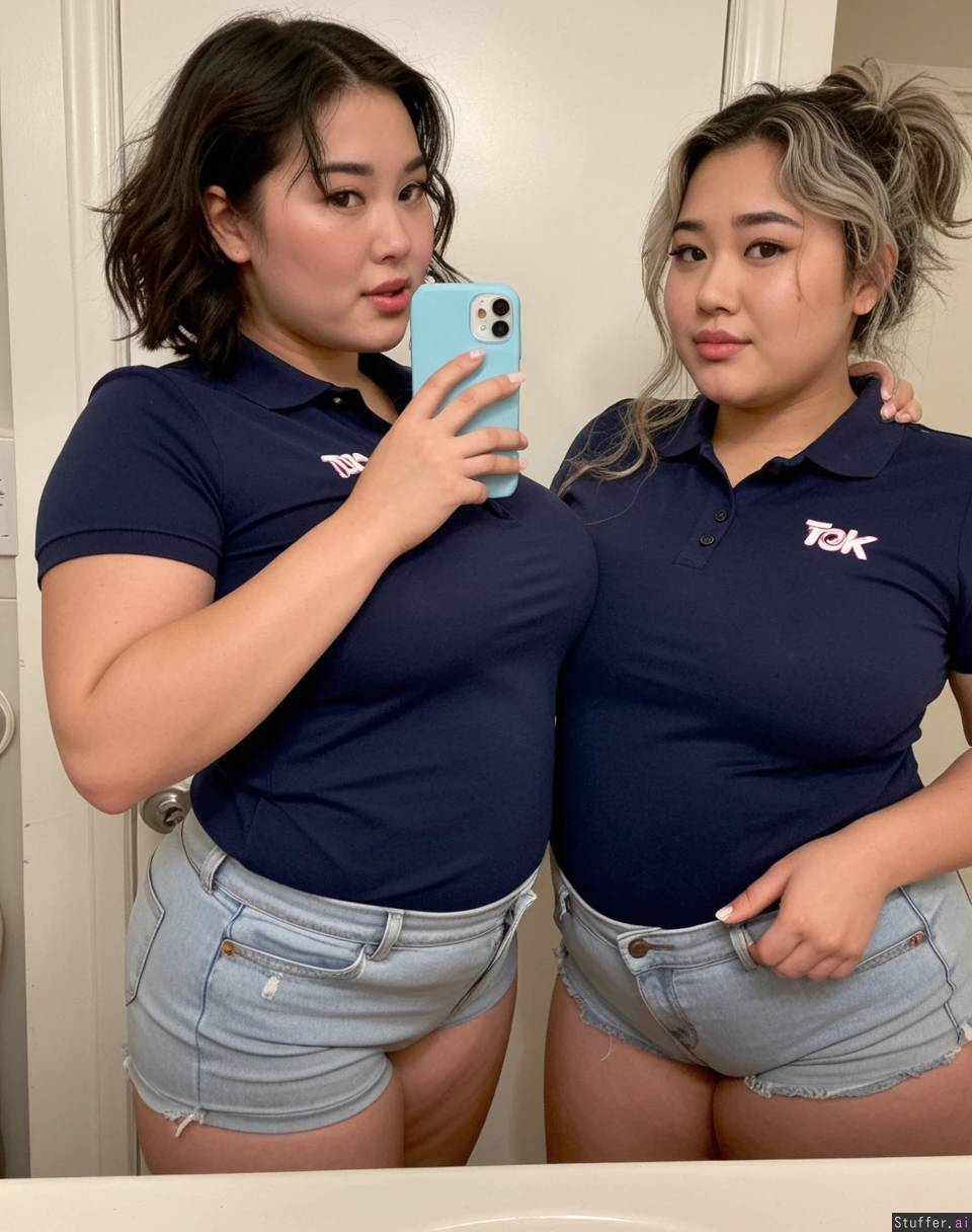 Body: pretty face, plus size supermodels, (overweight), (fat), pretty, 19, hot stunning face detail, (twins), Outfit: ((navy polo top)), light gray Jean shorts, modest, uniform Pose: inviting, enjoying each other , baddest bitches, stoic, Location: bathroom, (Two korean plump women filming a hot tiktok), messy tousled hair, dark super short hair,